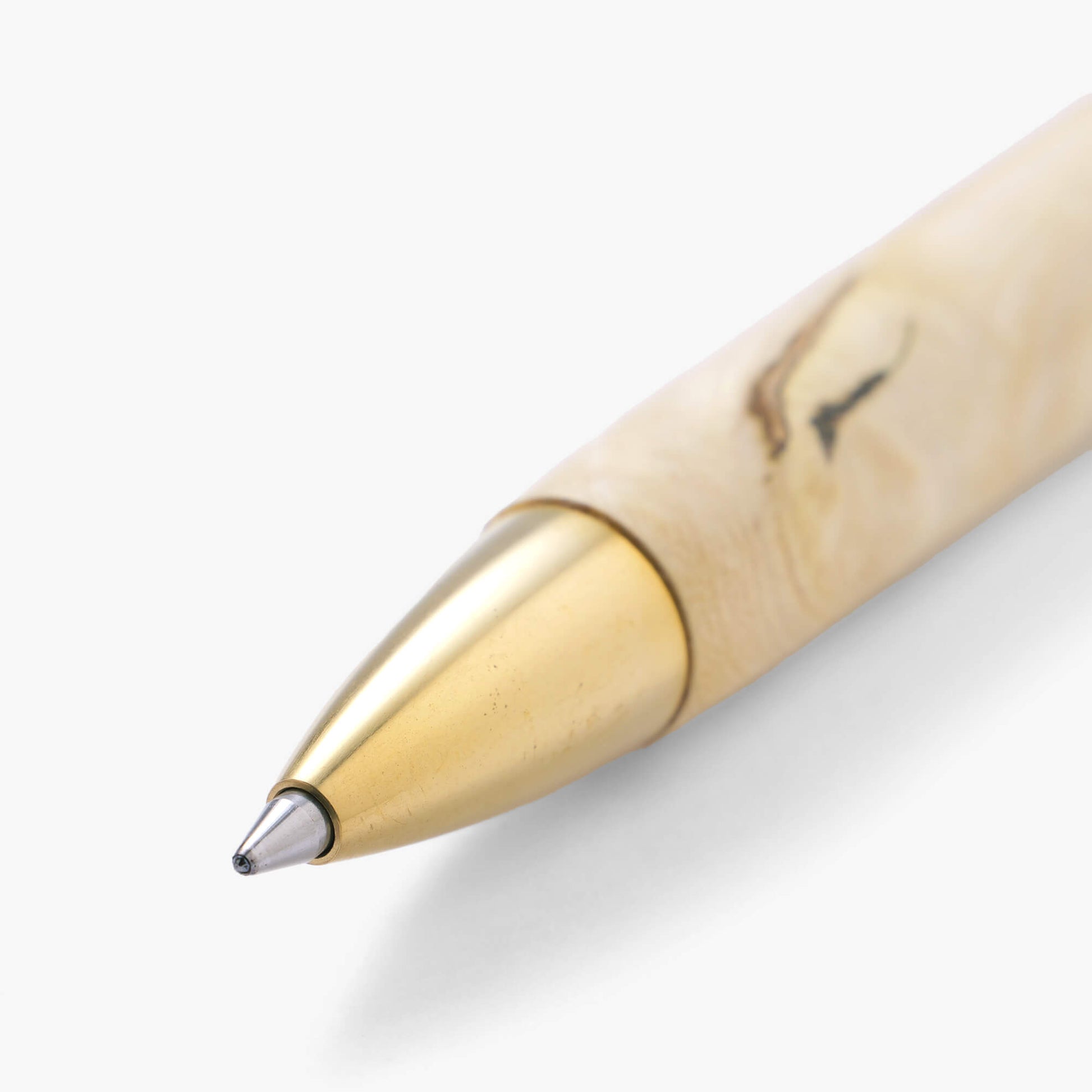 ノック部品と先金はオリジナルで制作した真鍮製のもの。無塗装のため、真鍮のエイジングを楽しめます。木の経年変化とともに、自分だけの一本に育てる楽しみを味わえるペンです(クリップは真鍮製ではありません)。