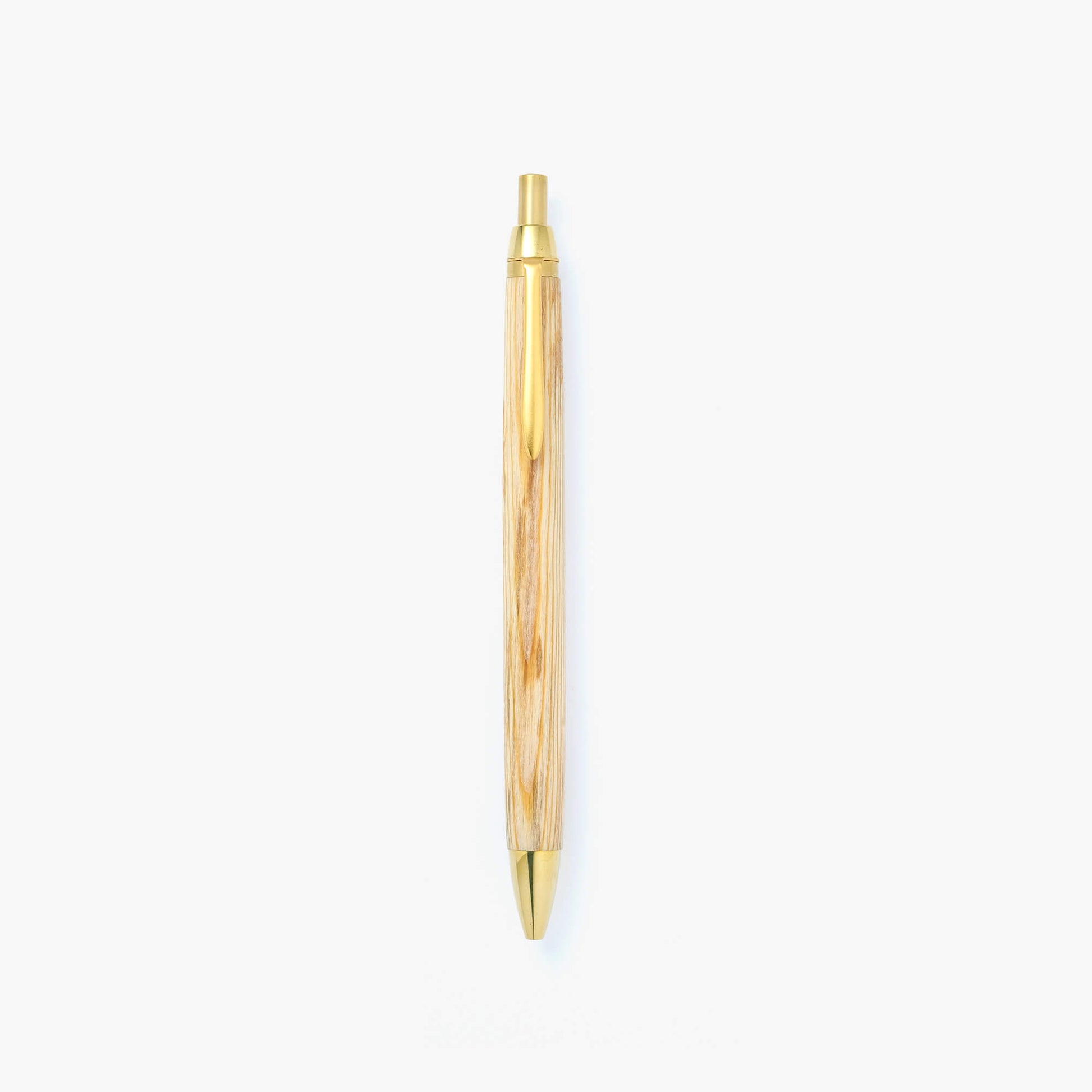 ノック部品と先金はオリジナルで制作した真鍮製のもの。無塗装のため、真鍮のエイジングを楽しめます。木の経年変化とともに、自分だけの一本に育てる楽しみを味わえるペンです(クリップは真鍮製ではありません)。