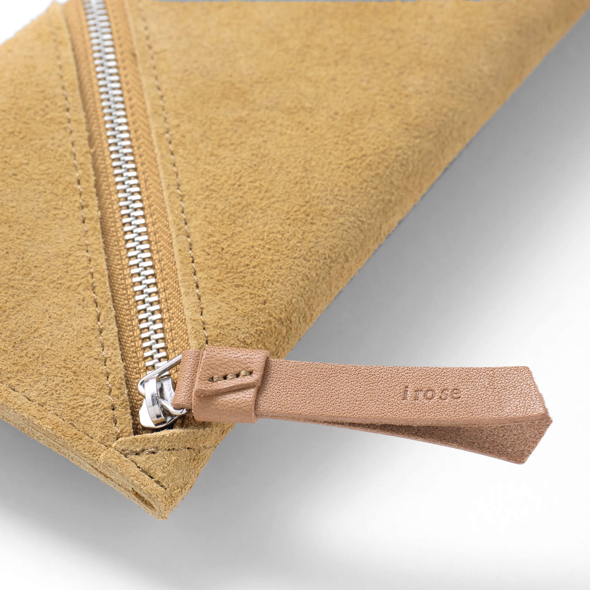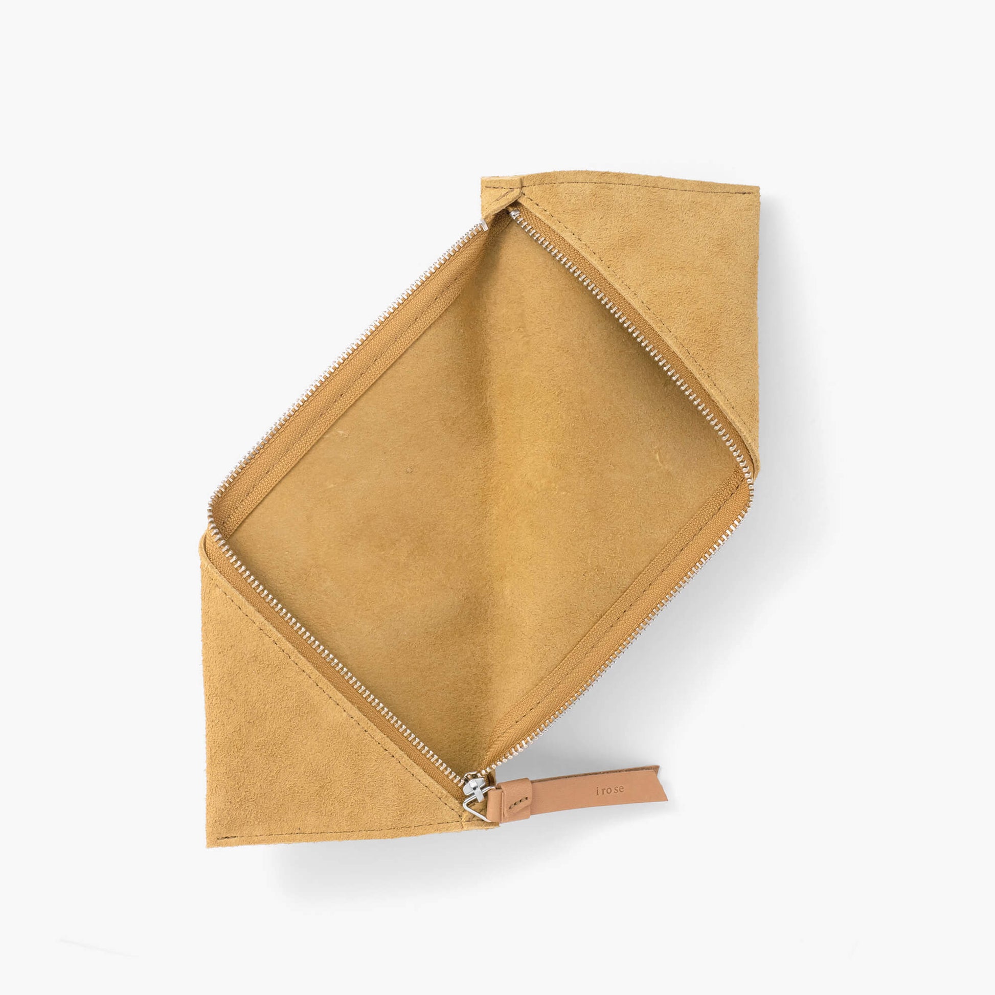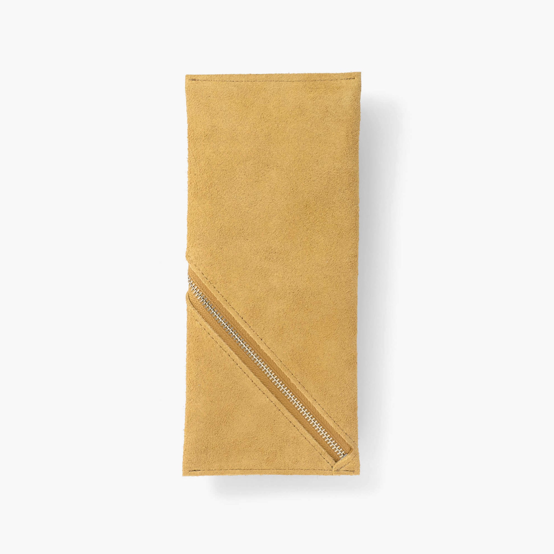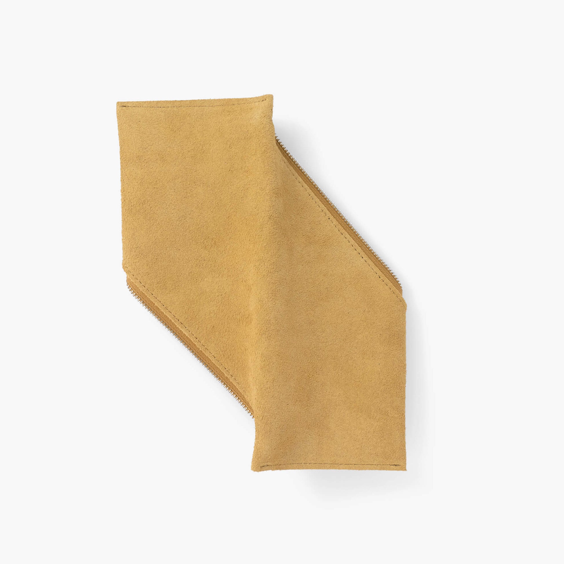 螺旋状にファスナーを開閉するデザインのスエード革のペンケース。ファスナーを開けた状態で机に置くと、ペントレーとしても使えます。